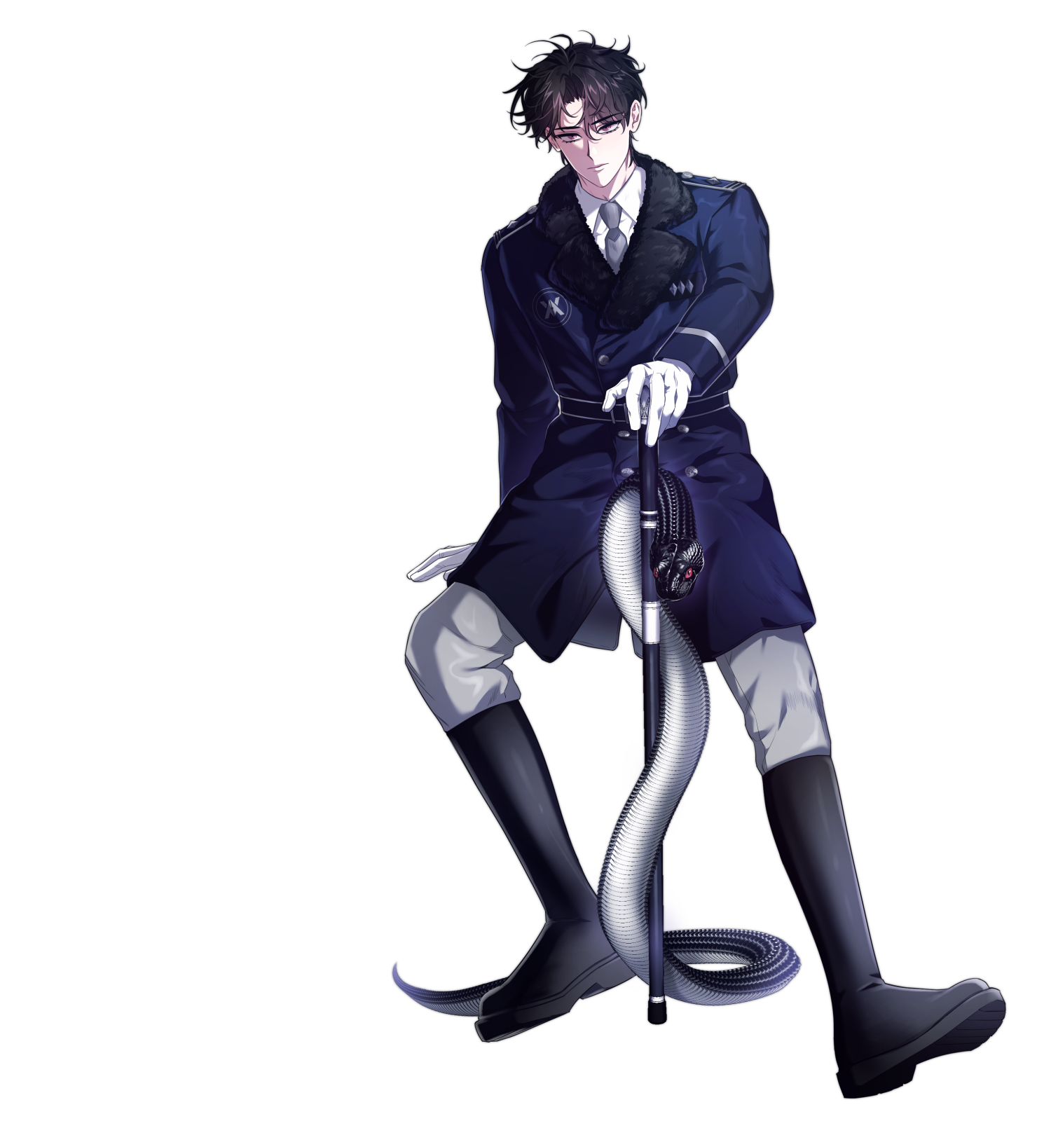 눈은 오묘한 분홍빛을 띠며, 일직선으로 가늘게 올라간 눈매와 ‘뱀’의 영향으로 인한 뾰족한 송곳니가 특징.